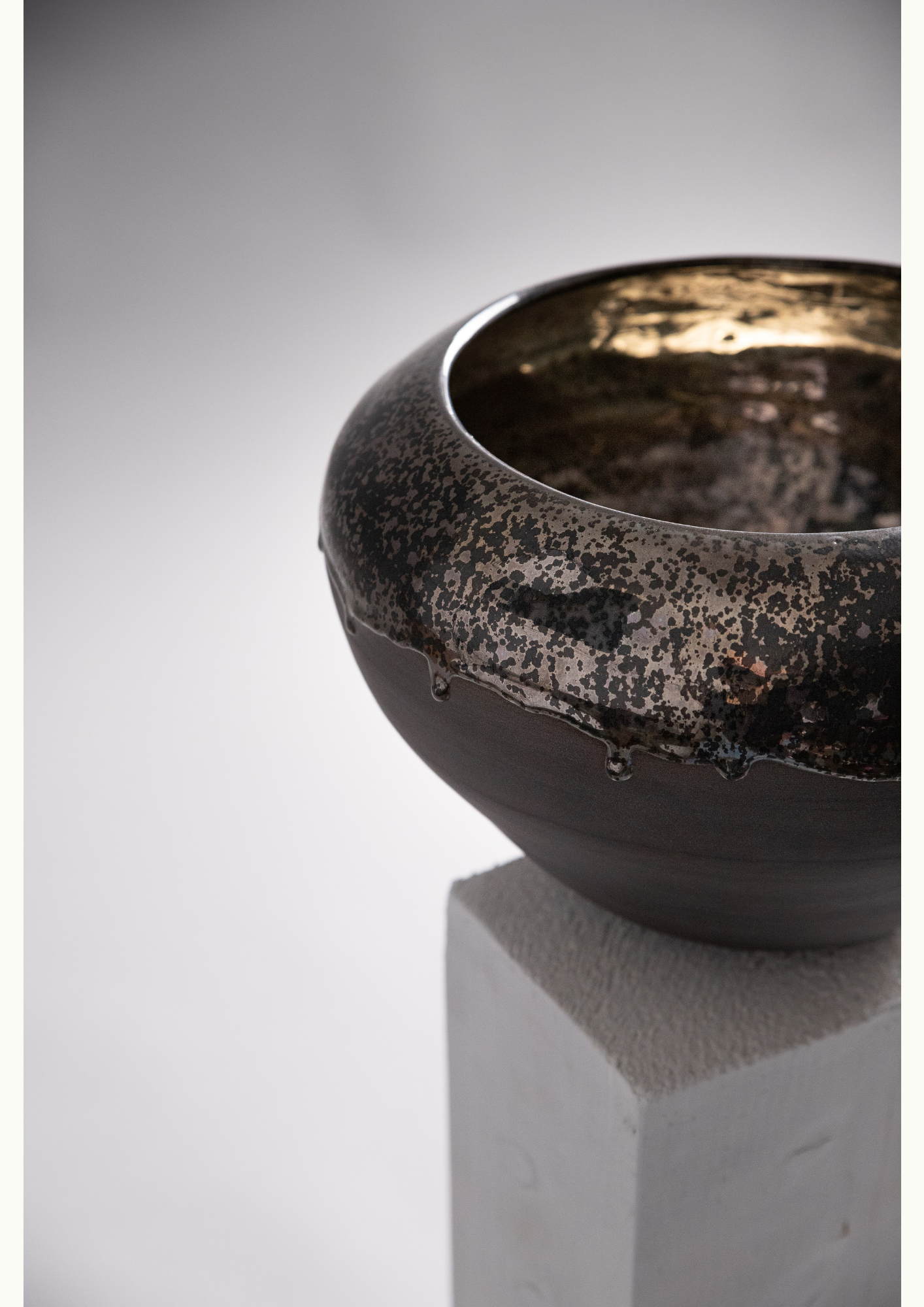 Vaso realizzato in grès nero e decorato con smalto old mirror.
